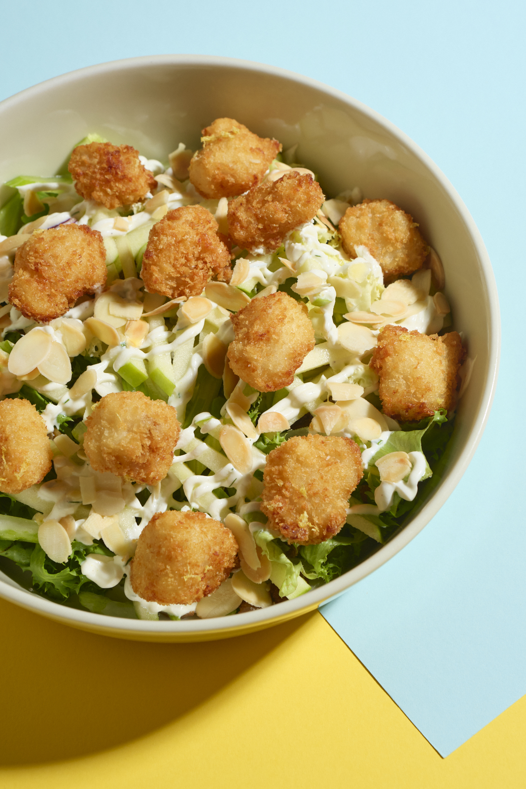 Caesar salad di dentice fritto, misticanza, sedano, salsa caesar, mela verde, mandorle tostate e uvetta