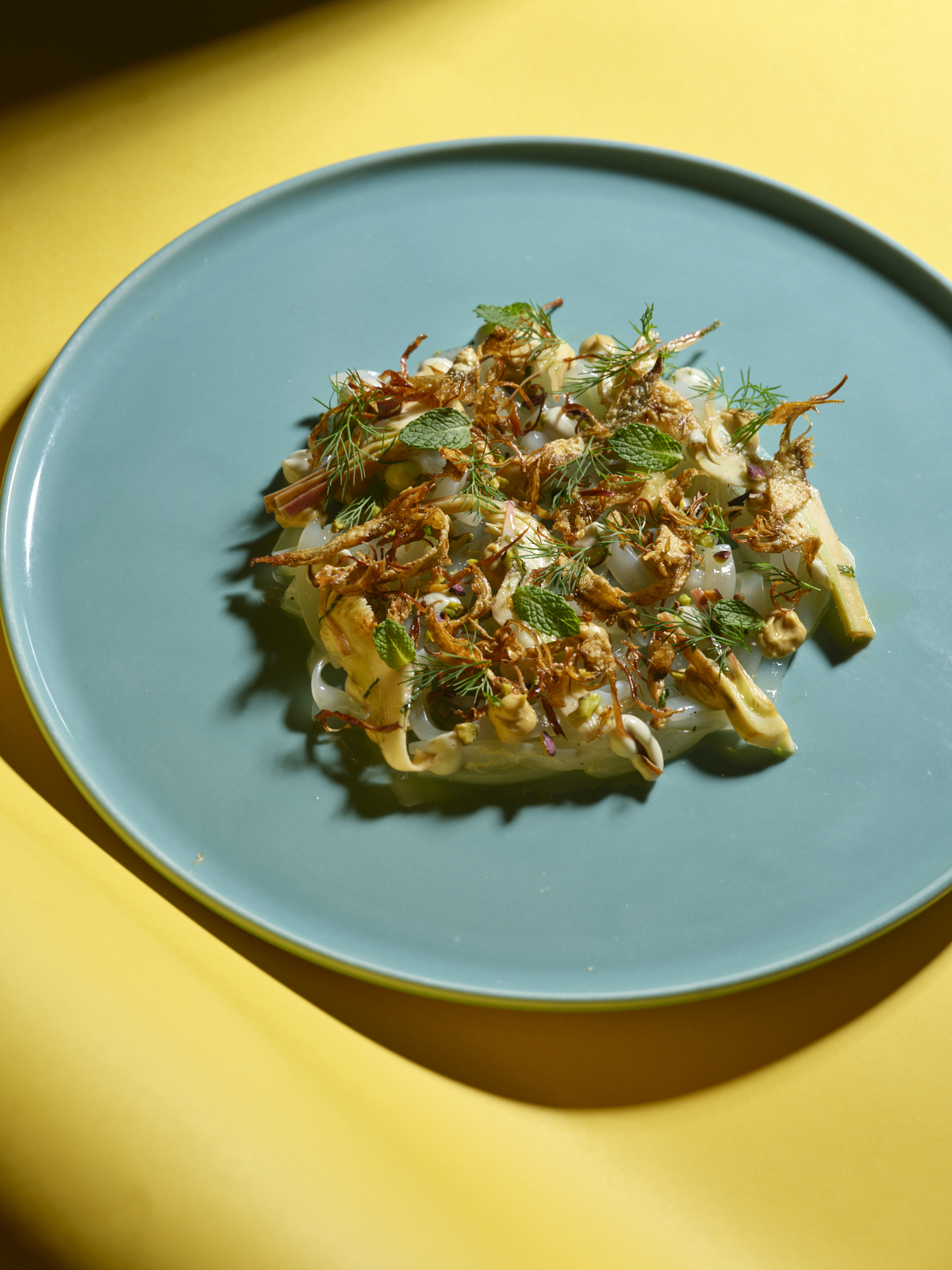Julienne di seppia, carciofi, pistacchio, salsa alle ostriche, gel di limone e menta